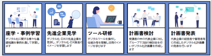 全8回の講座(座学・先進企業(株式会社カクイチ様)見学・ツール操作・グループワーク等)を通じて、課題の可視化から改善策の立案を行うことで、企業のみならず、支援機関やIT事業者の実践的な課題解決力を高めます。現場課題解決力養成講座チラシ